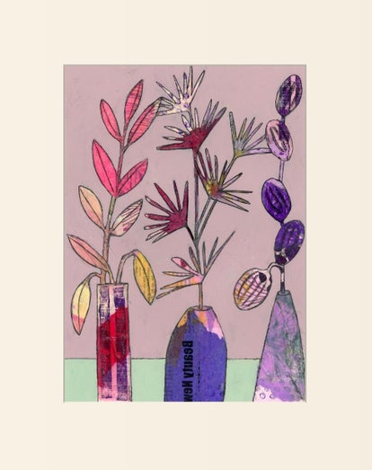 The original artwork is a collage/acrylic painting on paper depicting a still life of three vases with imagined foliage.